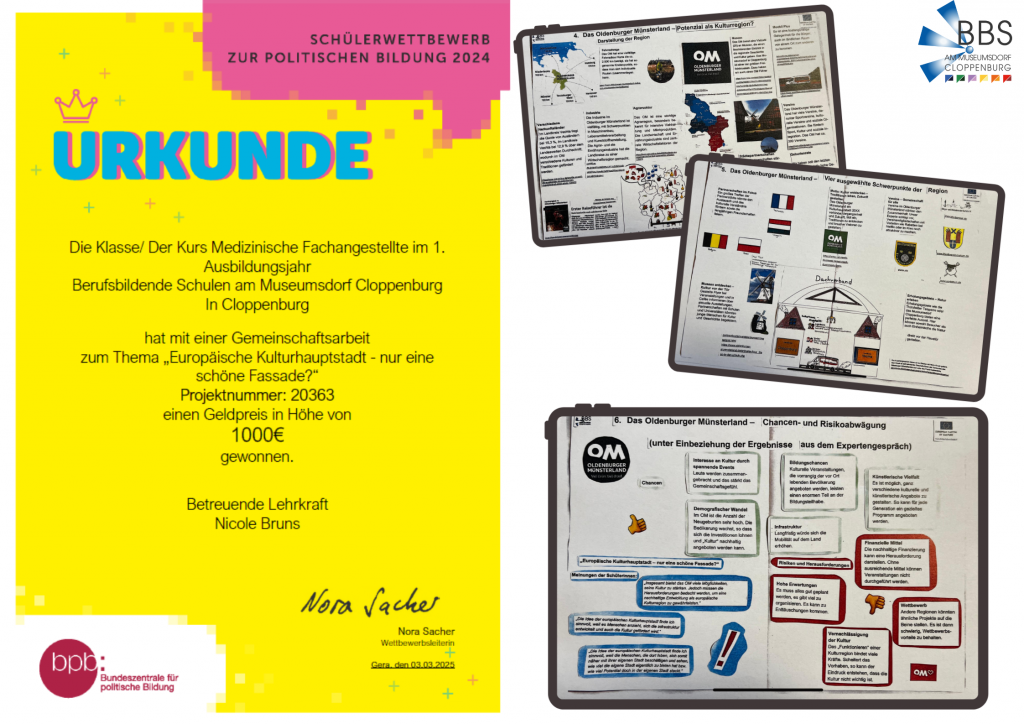 Politisch interessiert, gesellschaftlich engagiert und kreativ in der Umsetzung: Die Medizinischen Fachangestellten im 1. Ausbildungsjahr überzeugten mit ihrer Gemeinschaftsarbeit zum Thema „Europäische Kulturhauptstadt – nur eine schöne Fassade?“ im Rahmen des Schülerwettbewerbs zur politischen Bildung 2024. Die Schülerinnen der BBS am Museumsdorf wurden dafür mit einem Geldpreis in Höhe von 1.000 Euro ausgezeichnet. Die Projektleitung übernahm die Fachlehrerin Nicole Bruns.