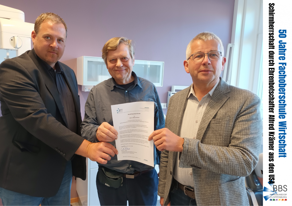 Bild 2: Alfred Krämer, Ehrenbotschafter der BBS am Museumsdorf in Wisconsin, USA, mit dem Stellvertretenden Schulleiter Folker Arndt (links) und Schulleiter Günter Lübke (rechts) [Fotograf: Niko Potthoff]