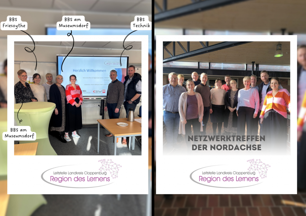 Auf dem ersten Foto sind die Mitglieder der Region des Lernens des Landkreises Cloppenburg zu sehen, (v.l.n.r.): Anne Mutscher (Caritas Sozialwerk und Ansprechperson für die Region des Lernens in Cloppenburg), Lena Strauch (Caritas Sozialwerk und Ansprechperson für die Region des Lernens an der BBS Friesoythe), Anne Bröring (verantwortlich für die Laufbahnberatung an den BBS am Museumsdorf), Sabrina Loxen (Leitung der Leitstelle der Region des Lernens im Landkreis Cloppenburg), Lena Groß (verantwortlich für die Berufsorientierungsmodule an den BBS am Museumsdorf), Martin Tellmann und Martin Ostermann (verantwortlich für die Berufsorientierungsmodule an den BBS Technik Cloppenburg).