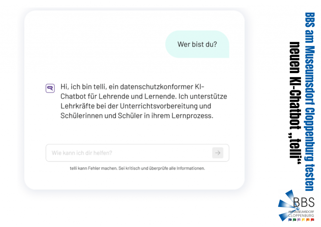 Die Berufsbildenden Schulen am Museumsdorf Cloppenburg sind vom Land Niedersachsen ausgewählt worden, den neu entwickelten, datenschutzkonformen KI-Chatbot „telli“ im Schulalltag zu erproben. Damit ist die BBS die einzige berufsbildende Schule im Zuständigkeitsbereich des Regionalen Landesamtes Schule und Bildung Osnabrück, die an der Pilotphase teilnimmt. „Darüber freuen wir uns sehr. Es ist eine Anerkennung der Expertise, die wir auf dem Weg zum KI-Kompetenzzentrum gewonnen haben“, betont Schulleiter Günter Lübke.