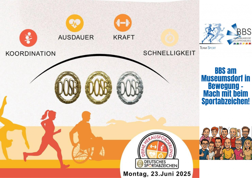 09.06.2025 – Am Montag, den 23. Juni 2025, veranstaltet das Team Sport einen Sporttag, an dem alle Schüler*innen der BBS am Museumsdorf die Möglichkeit haben, das Deutsche Sportabzeichen (DSA) abzulegen.