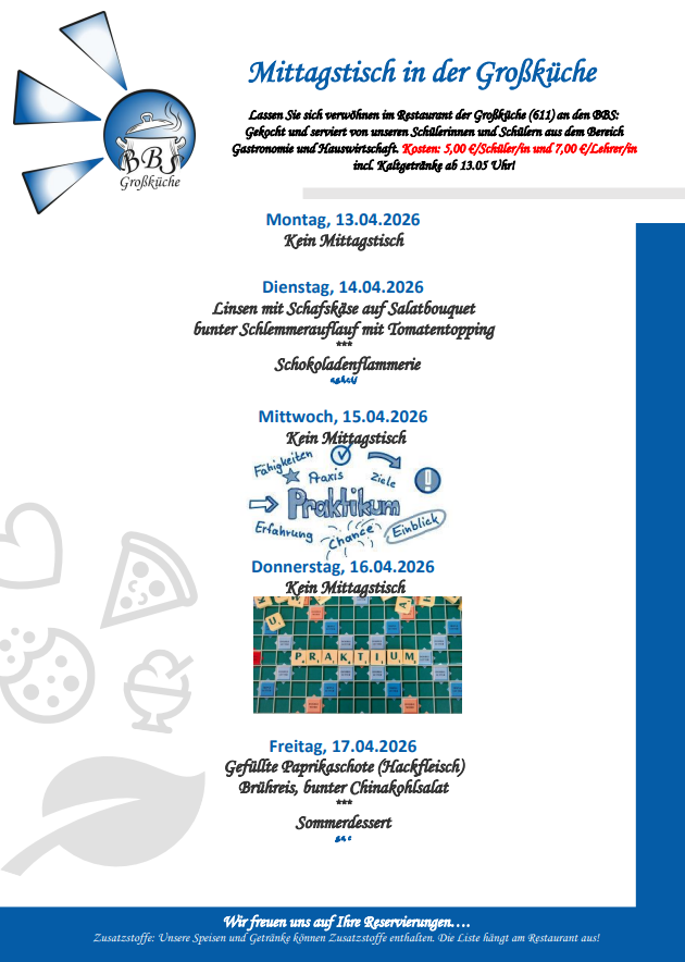 Jeden Mittag erwartet Sie in unserer Großküche ein kulinarisches Highlight, das Sie sich nicht entgehen lassen sollten. Unser engagiertes Team aus Schülerinnen des Kompetenzzentrums für Ernährung, Hauswirtschaft und Gastronomie zaubert für Sie ein abwechslungsreiches 3-Gänge-Menü, bestehend aus einer köstlichen Vorspeise, einem herzhaften Hauptgang und einem süßen Nachtisch. Unterstützt von erfahrenen Lehrkräften, lernen die Schülerinnen nicht nur die Kunst des Kochens, sondern auch das Eindecken und Servieren – und Sie profitieren davon!