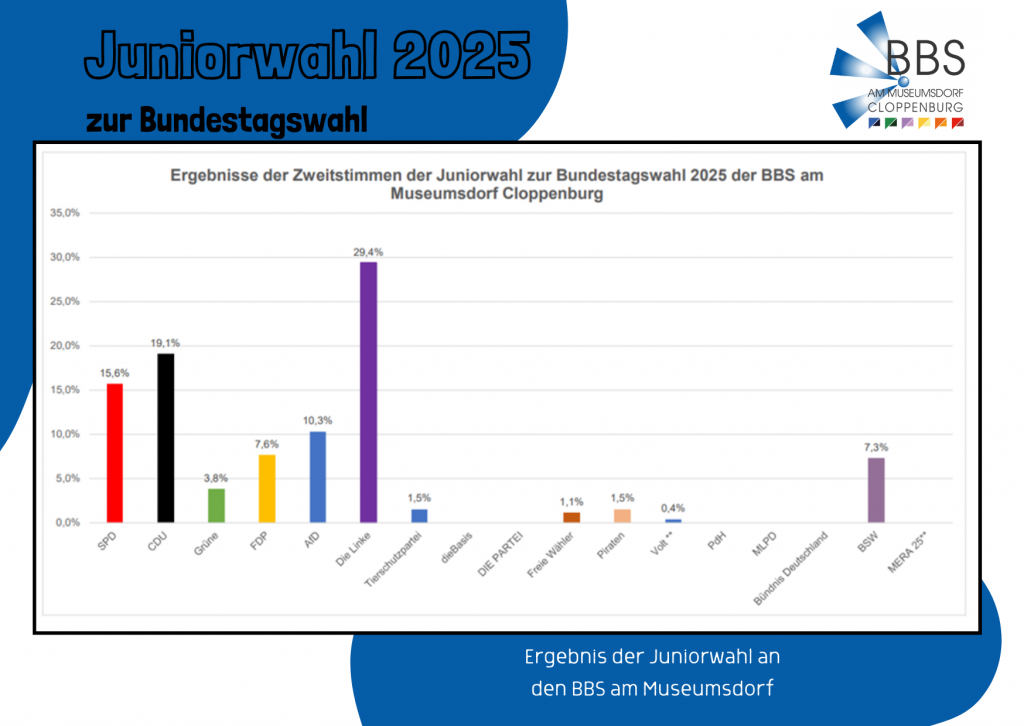 Etwa 380 Schüler*innen der BBS am Museumsdorf wählten wie folgt: Die Linke hatte den größten Wahlerfolg (29,4%), gefolgt von der CDU (19,1%) und der SPD (15,6%). Mit etwas Abstand folgen dann die AfD (10,3%), die FDP (7,6%) die BSW (7,3%) und die Grünen (3,8%). Die Tierschutzpartei und die Piraten erhielten jeweils 1,5%, die Freien Wähler 1,1% und Volt 0,4%.