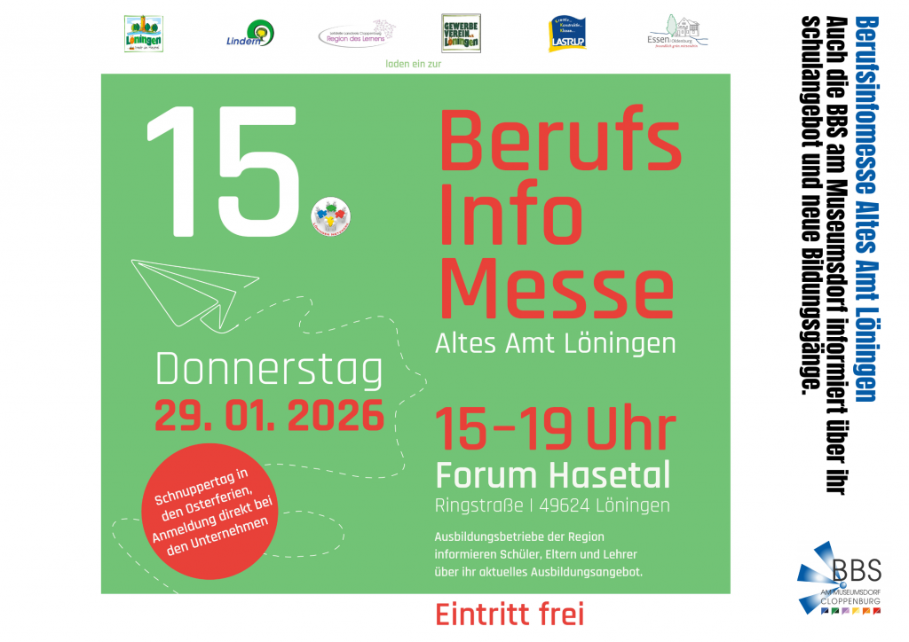 28.01.2026 – Die Berufsinfo-Messe „Altes Amt Löningen“ findet am Donnerstag, den 29.01.2026, im Forum Hasetal in Löningen statt. Von 15.00 Uhr bis 19.00 Uhr sind alle interessierten Schüler*innen und Eltern herzlich eingeladen, sich über die Ausbildungsmöglichkeiten der ausstellenden Firmen und Schulen zu informieren.