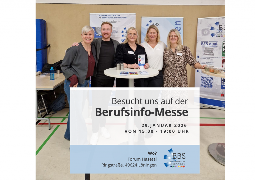 28.01.2026 – Die Berufsinfo-Messe „Altes Amt Löningen“ findet am Donnerstag, den 29.01.2026, im Forum Hasetal in Löningen statt. Von 15.00 Uhr bis 19.00 Uhr sind alle interessierten Schüler*innen und Eltern herzlich eingeladen, sich über die Ausbildungsmöglichkeiten der ausstellenden Firmen und Schulen zu informieren.