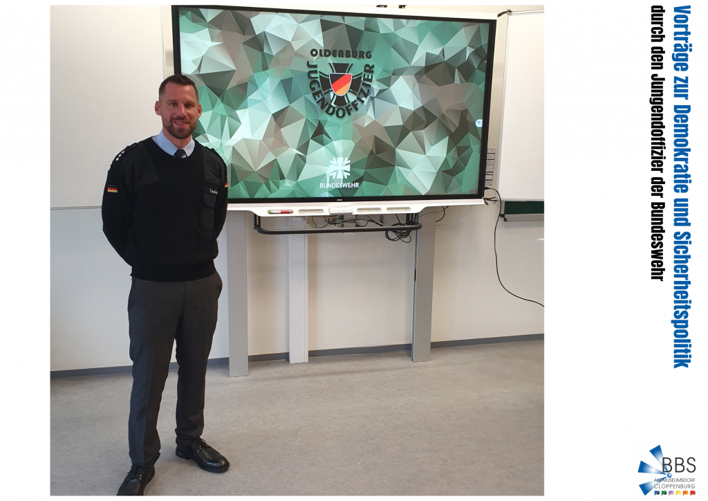 Im Rahmen der Demokratiebildung besucht der Referent der Bundeswehr regelmäßig die BBS, um ergänzend zum Unterricht über aktuelle Entwicklungen und Problematiken aus einer externen Position zu berichten und um so das Interesse der Schüler*innen zu fördern, sich mit Politik auseinanderzusetzen.