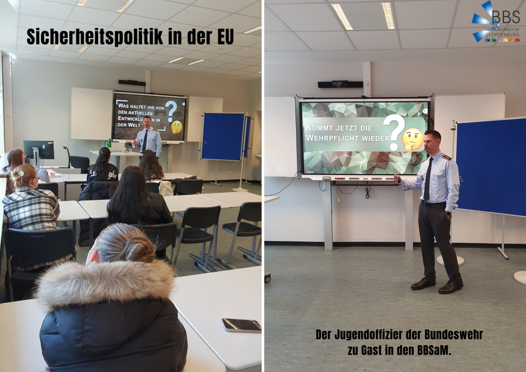 Anlässlich des Europatages am 9. Mai und des bundesweiten EU-Projekttags an Schulen rund um den 5. Mai hatten sechs Klassen aus verschiedenen Berufsfeldern die Möglichkeit, sich intensiv mit sicherheitspolitischen Fragestellungen im europäischen Kontext auseinanderzusetzen. Zu Gast war der Jugendoffizier der Bundeswehr, Malte Tautorat, der die Schüler*innen durch eine informative und diskussionsreiche Veranstaltung führte.