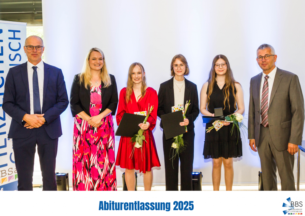 Beeindruckt von der Leistung der Abiturientia 2025 zeigte sich Schulleiter Günter Lübke. 102 Absolvent*innen verlassen nun mit dem höchsten deutschen Schulabschluss die BBS. Zwölf von ihnen erreichten einen Notendurchschnitt mit einer Eins und 50 Schüler*innen mit einer Zwei vor dem Komma. Laura Sophie Rother, Jana Schnieder und Emily Kelsch erzielten mit einer 1,5 die beste Abiturnote. Allen drei wurde dafür eine Medaille des Landkreises überreicht. Zudem wurde Jennifer Deters für herausragende Leistungen in der Informatik von der Gesellschaft für Informatik geehrt. Greta Dellwisch bekam für ihre herausragenden Abiturleistungen in Mathematik den Abiturpreis der Deutschen Mathematiker-Vereinigung.