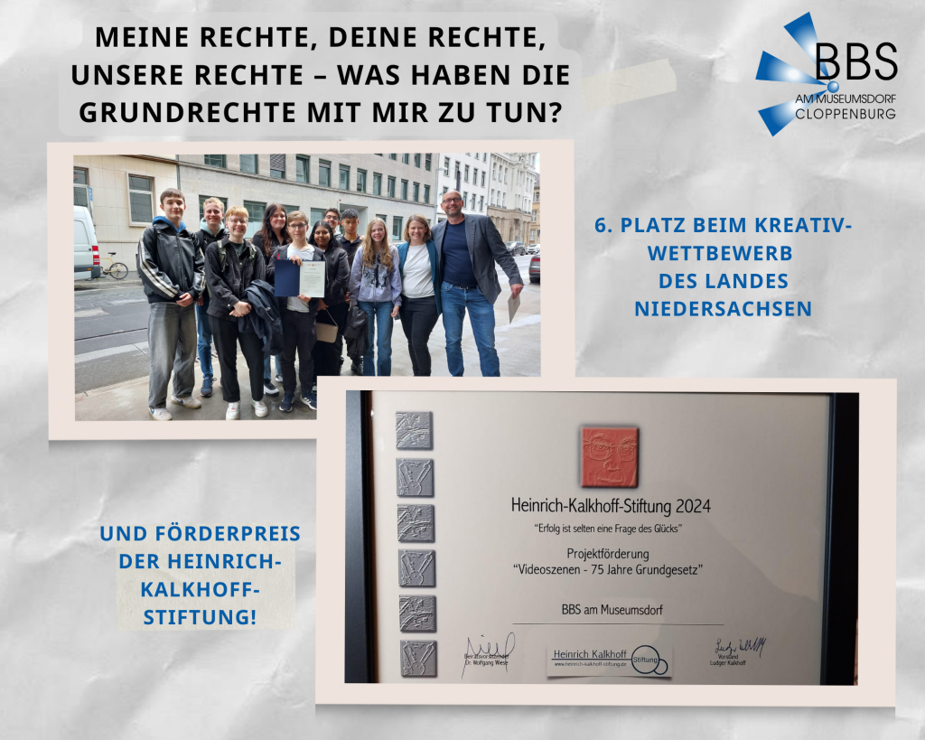 29.12.2024 – Letztes Schuljahr nahm die BGW 1-3 (11. Klasse Berufliches Gymnasium Wirtschaft) mit ihrem Klassenlehrer Georg Stolle beim Kreativwettbewerb des Landes Niedersachsens teil. Sie erstellten ein Video zu der Frage: Meine Rechte, deine Rechte, unsere Rechte – Was haben die Grundrechte mit mir zu tun? Damals gewannen die Gymnasiast*innen den 6. Platz beim Kreativwettbewerb.