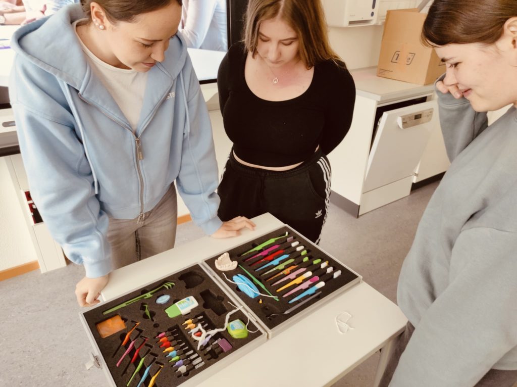 25.07.2023 – Die Zahnmedizinischen Fachangestellten (ZFA) lernen in ihrer Ausbildung, wie und mit welchen Hilfsmitteln man eine gute Zahnpflege betreibt. Um das theoretische Wissen der Schülerinnen zu ergänzen, organisierte das Lehrer-Team um Elly Wurz einen Workshop mit dem Unternehmen TePe. TePe stellt unterschiedliche Mundhygiene-Produkte, wie Zahnpasten, Interdentalbürsten, Zahnseide, Zahnbürsten, u.Ä. her. Außerdem geben die Mitarbeiter*innen Schulungen zur Mundgesundheit, Nachhaltigkeit, Pflege von Implantaten, Kommunikation und Motivation von Patienten.