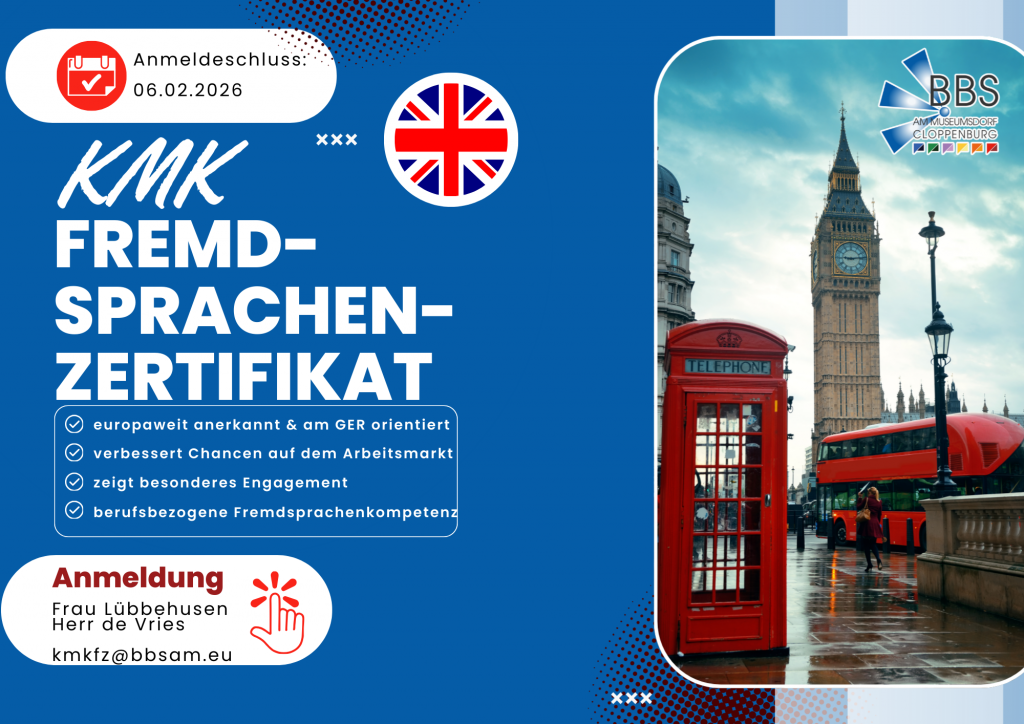 Alle Schüler*innen der BBS am Museumsdorf sind herzlich eingeladen, sich zu den diesjährigen Prüfungen für den Erwerb des KMK-Fremdsprachenzertifikats Englisch in unserem Hause anzumelden.