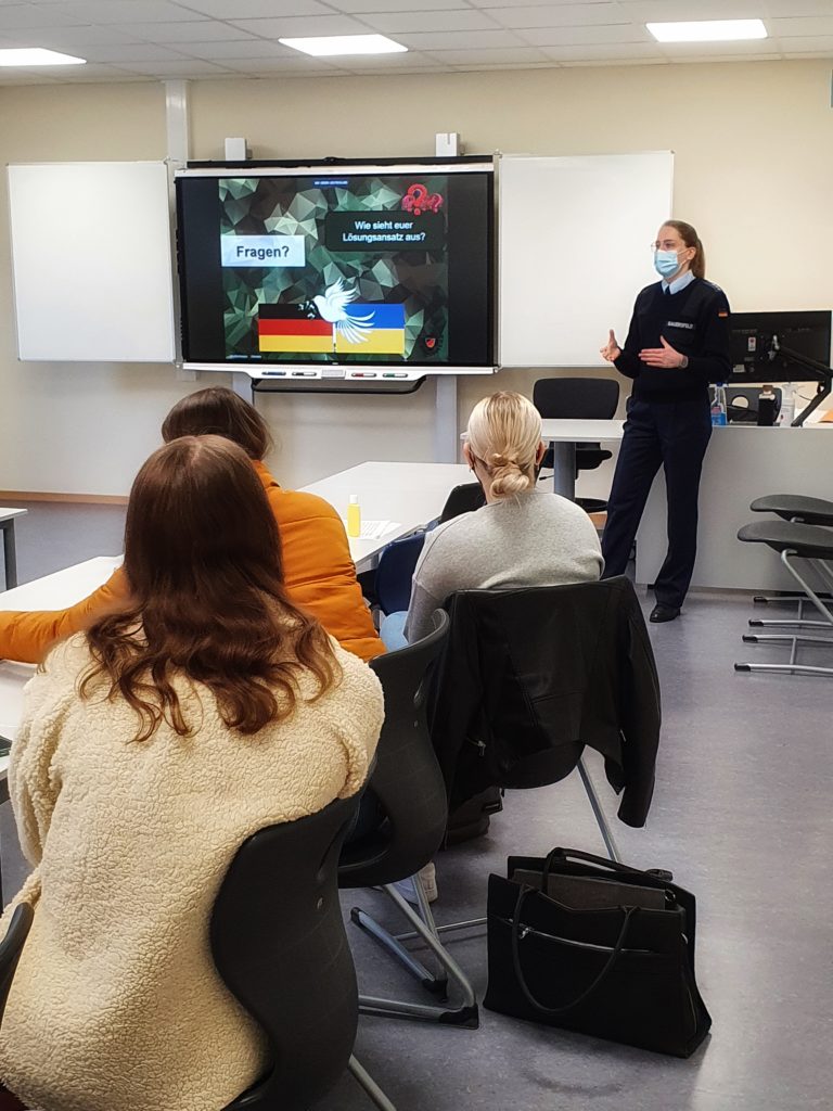 Hauptmann Bauersfeld referierte kurz über die Geschichte des Konflikts zwischen der Ukraine und Russland, um den Schülern die aktuelle politische Lage verständlich zu machen. Sie betonte, dass Angriffe auf die Menschenrechte und auf demokratische Prinzipien nicht hinnehmbar sind.