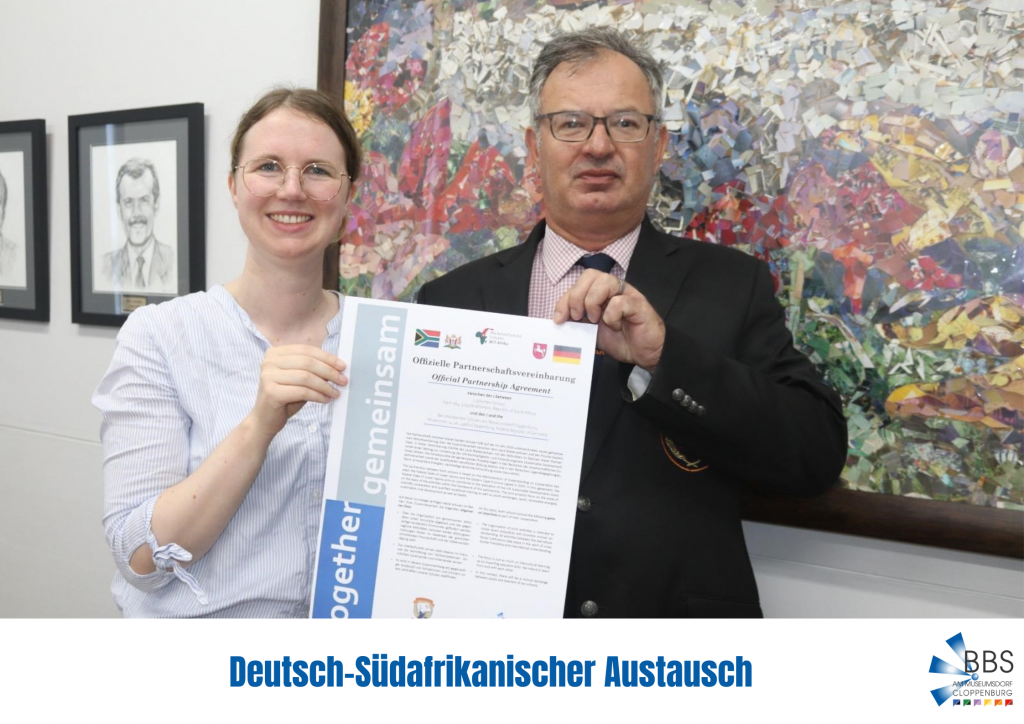 Bild 1: Nic Els und Maren Sandmann mit dem neuen Partnerschaftsabkommen zwischen der Lilyfontein School und der BBS am Museumsdorf.