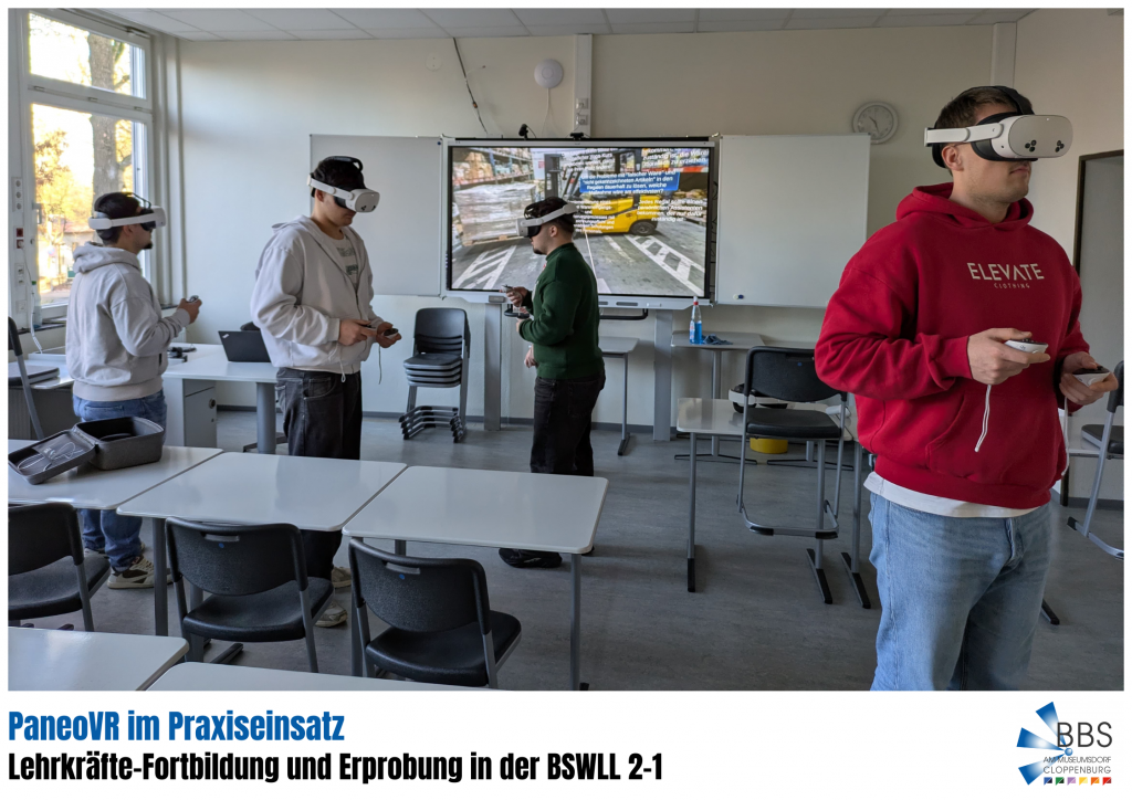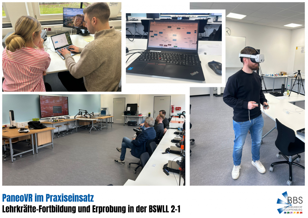 03.01.2025 – Vor kurzem fand an der BBS am Museumsdorf eine zweitägige Fortbildung zum Virtual-Reality-Tool PaneoVR statt. Im Rahmen der Schulung entwickelten unsere Lehrkräfte eigene VR-Szenarien, lernten die technischen Möglichkeiten kennen und erprobten didaktische Einsatzformen.