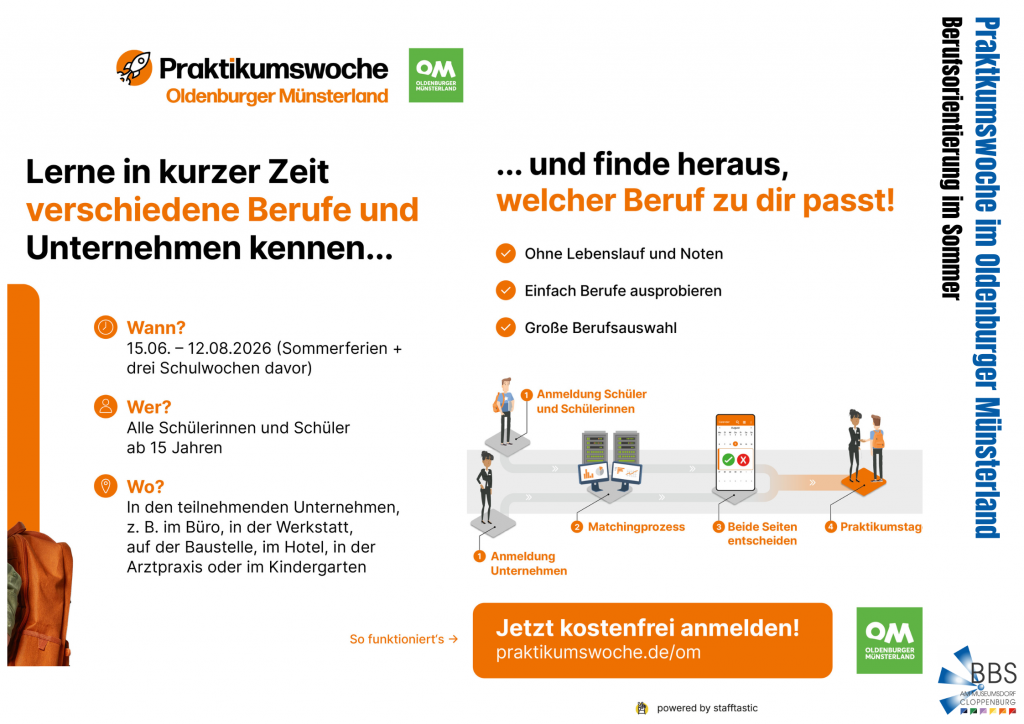 Übrigens: Falls du noch auf der Suche nach einem längeren (Schul-)Praktikum bist, dann kannst du das in den Landkreisen Cloppenburg und Vechta jetzt auch ganz einfach über praktikum-om.de finden. Das Beste daran: Wenn du schon einen Account für die Praktikumswoche hast, kannst du diesen einfach nutzen, um deine Suche direkt dort zu starten!