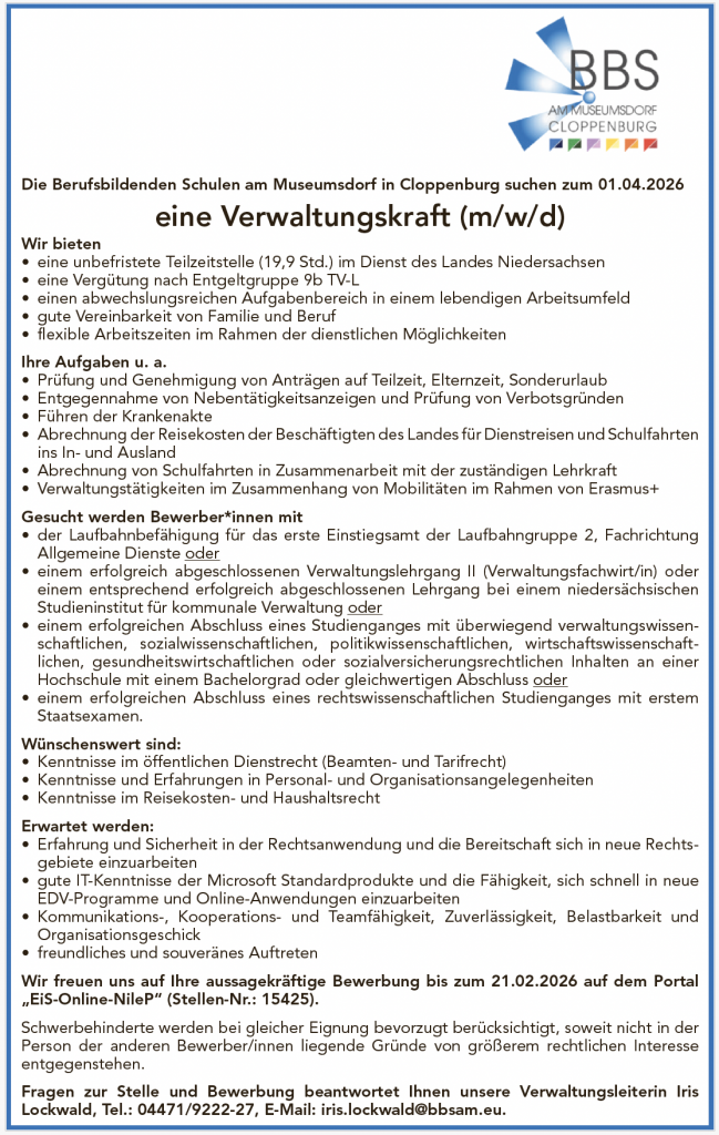 Informiere dich über unsere aktuellen Stellenangebote und Möglichkeiten zur Mitarbeit an der BBS. Da nicht alle Positionen ständig verfügbar sind, schau gern regelmäßig vorbei.
